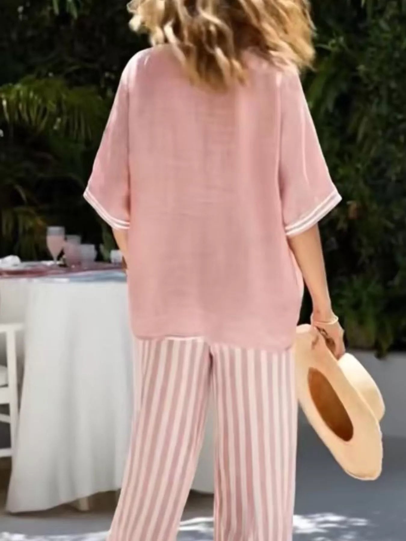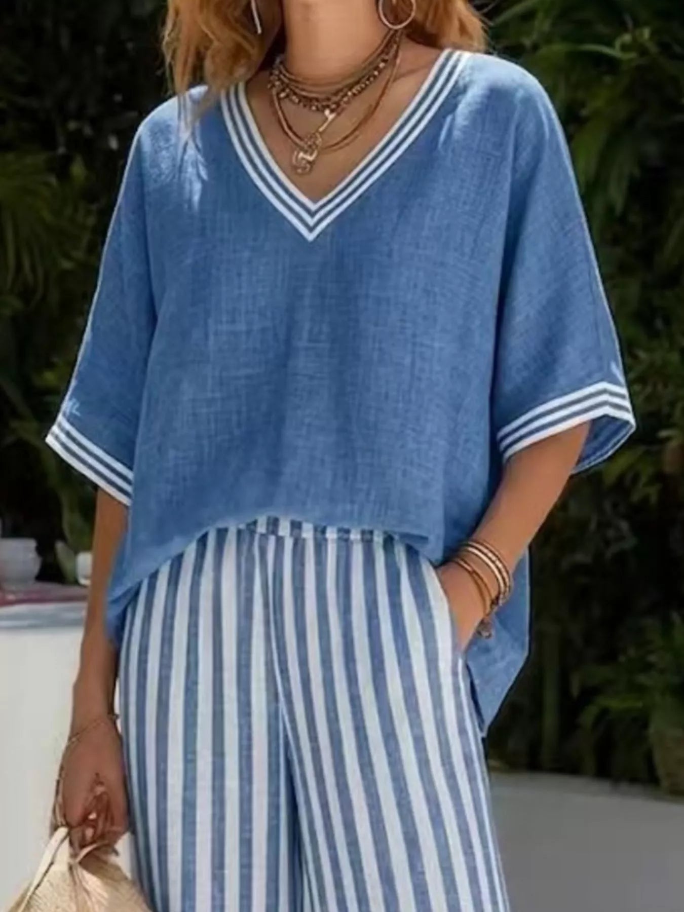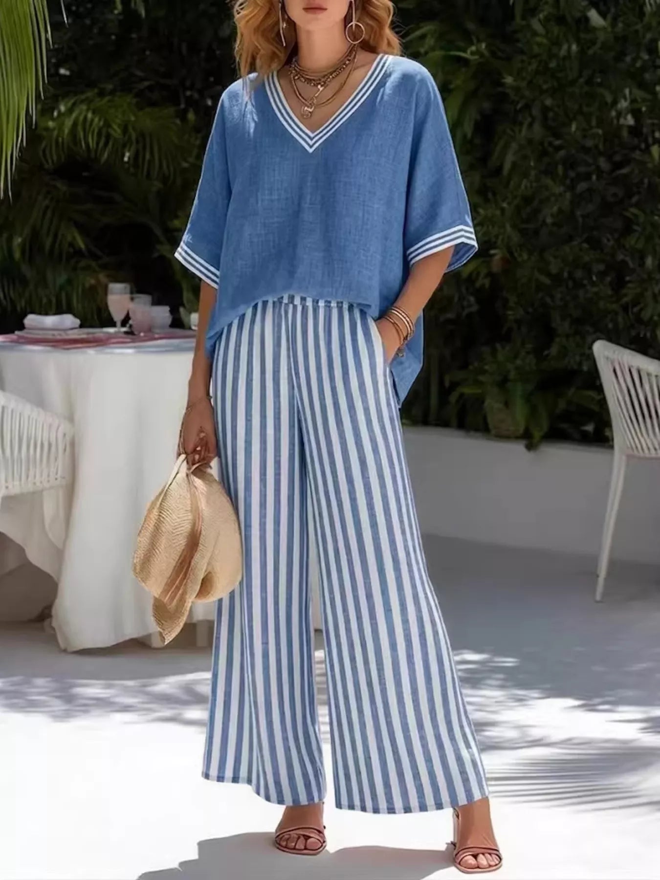 Plus Size Striped Two Piece Lounge Set – V-Neck Top & Wide Leg Pants Outfit