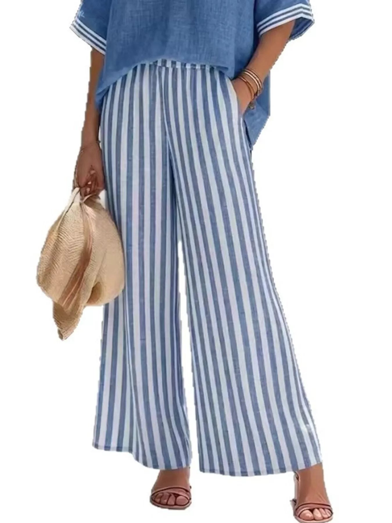 The soft, breathable fabric feels lightweight and easy to wear, while the classic striped pattern adds a trendy touch that never goes out of style. The wide-leg pants offer a loose, flattering fit with comfortable movement, making this set ideal for everything from lounging at home to stepping out in casual chic style.