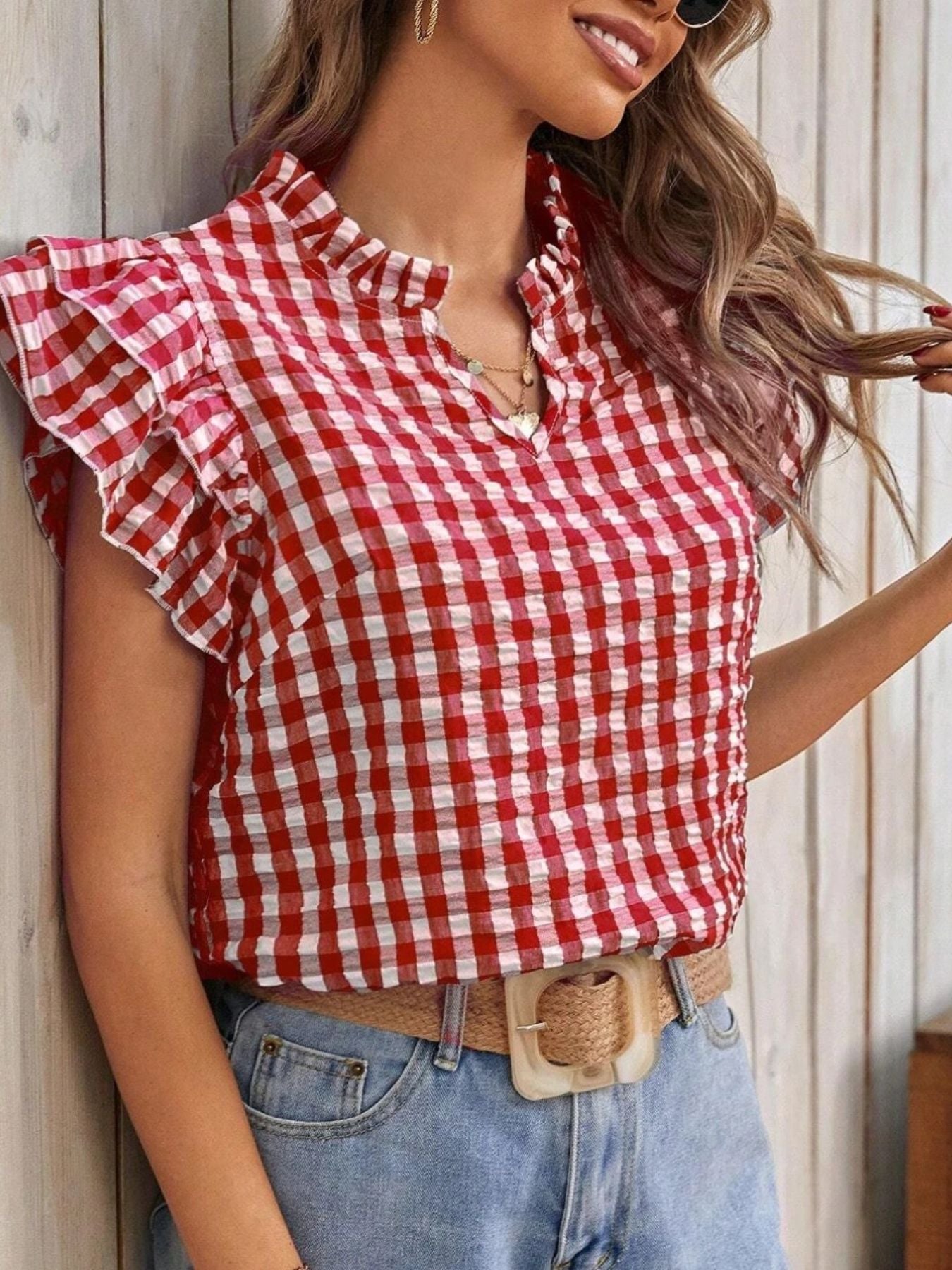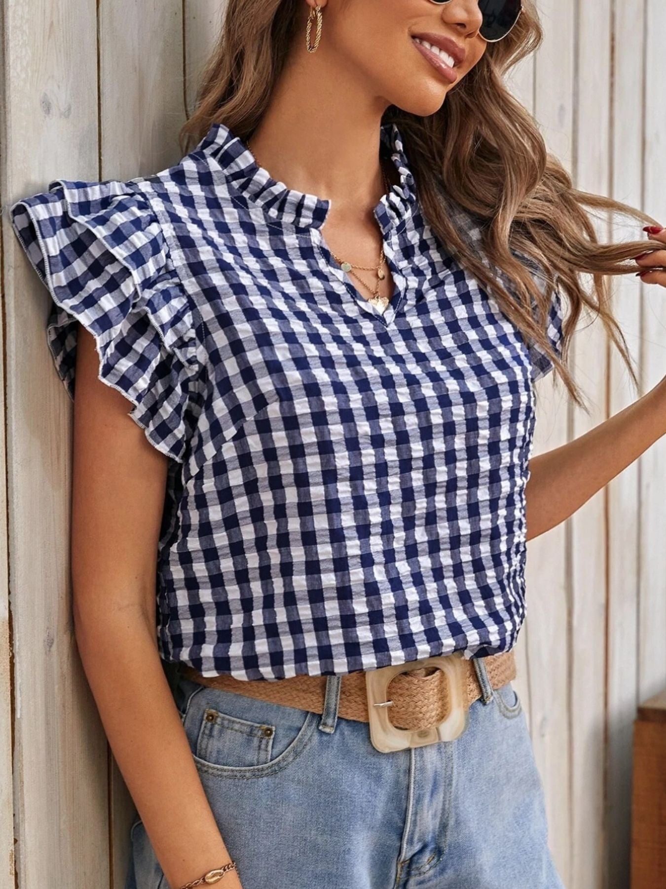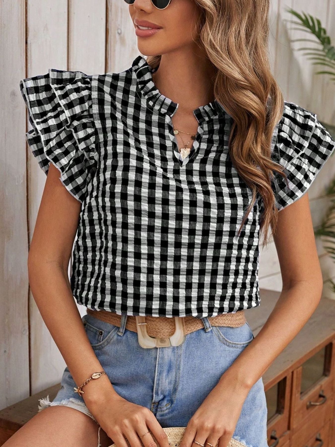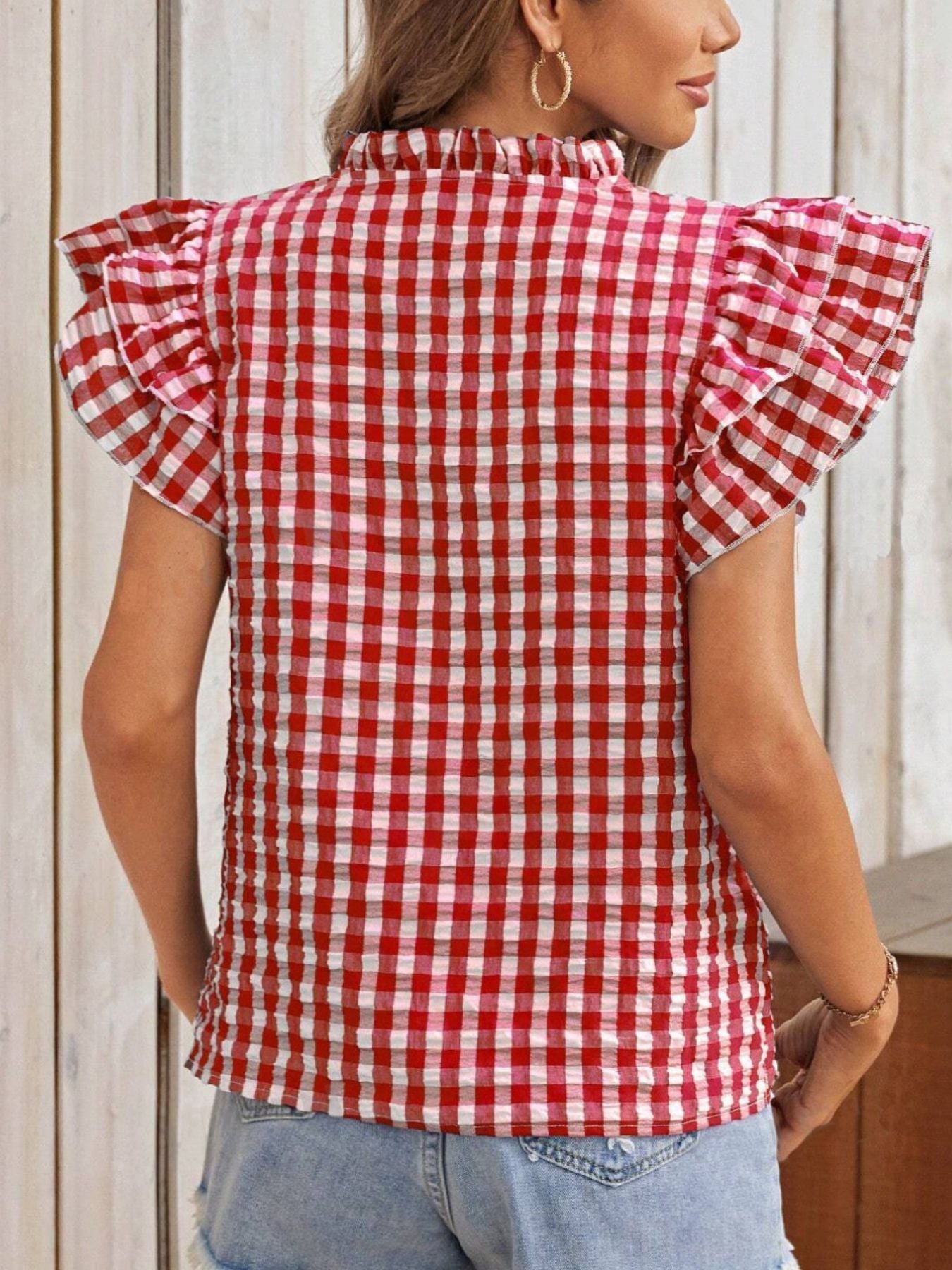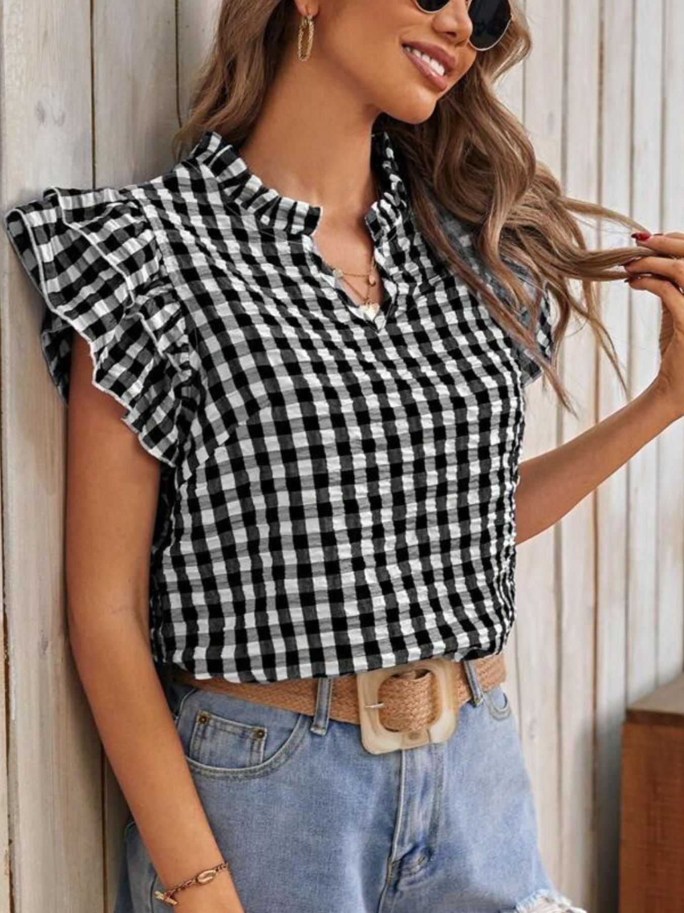 Gingham Ruffle Sleeve Blouse – V-Neck Casual Puff Sleeve Summer Top