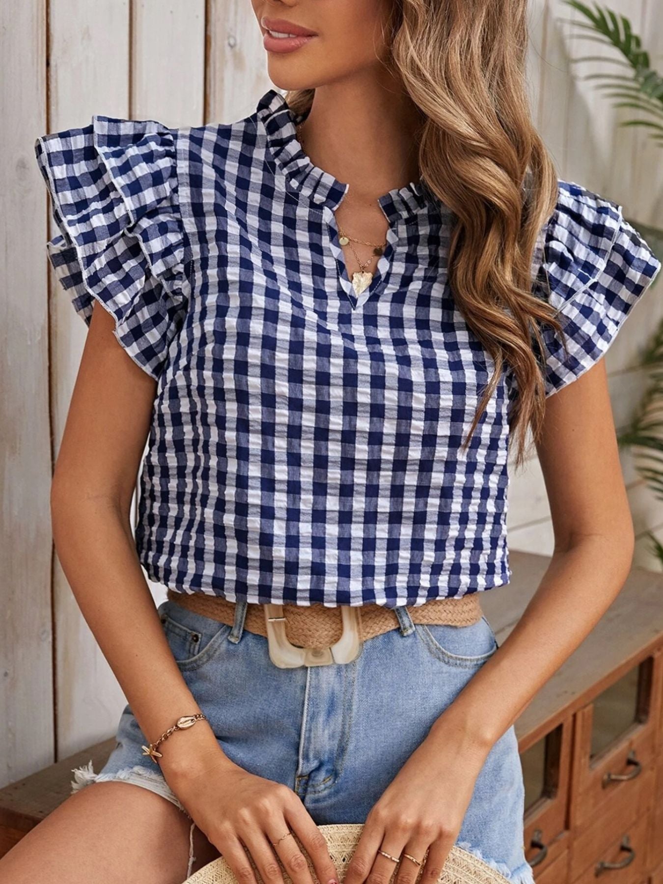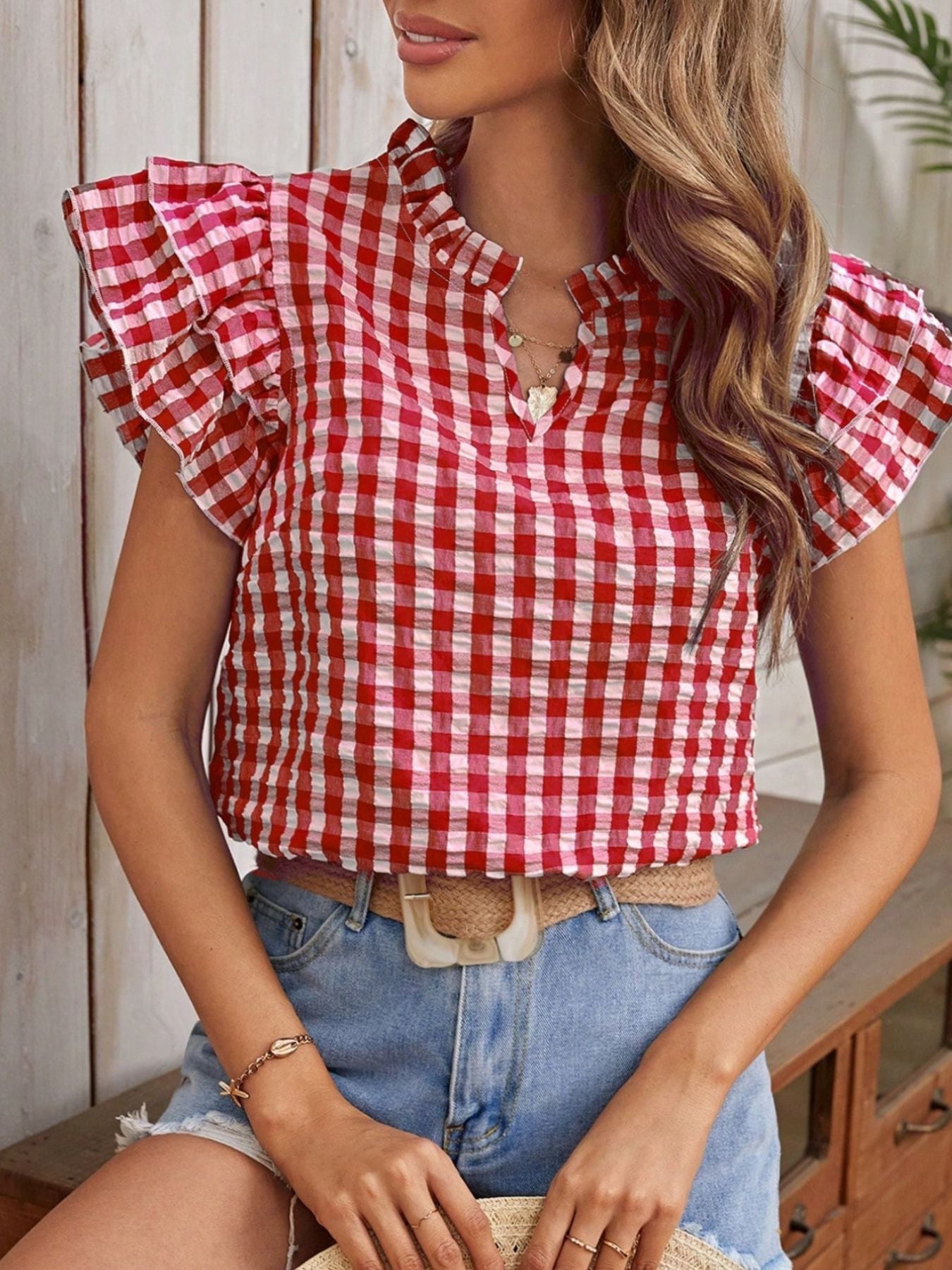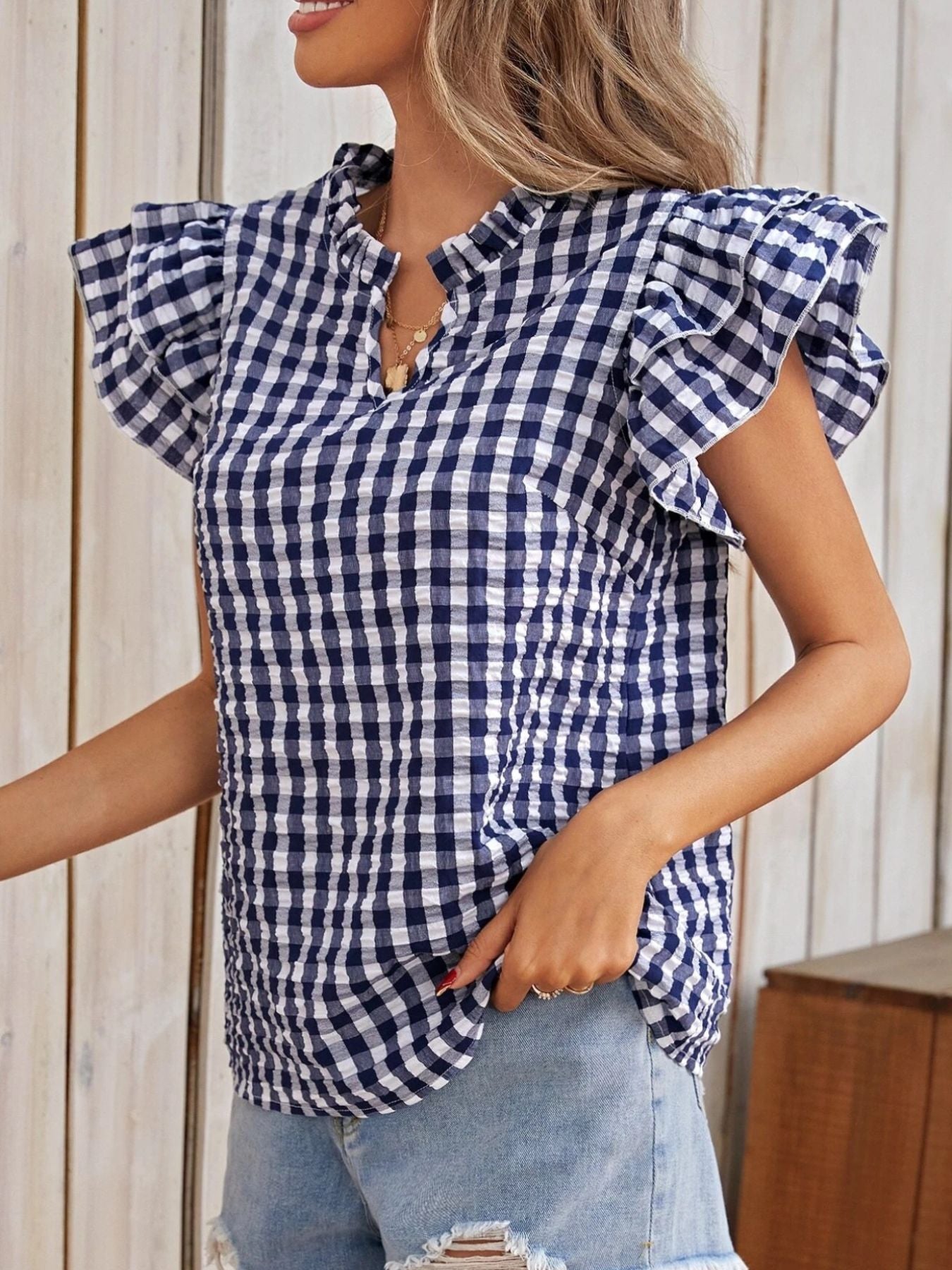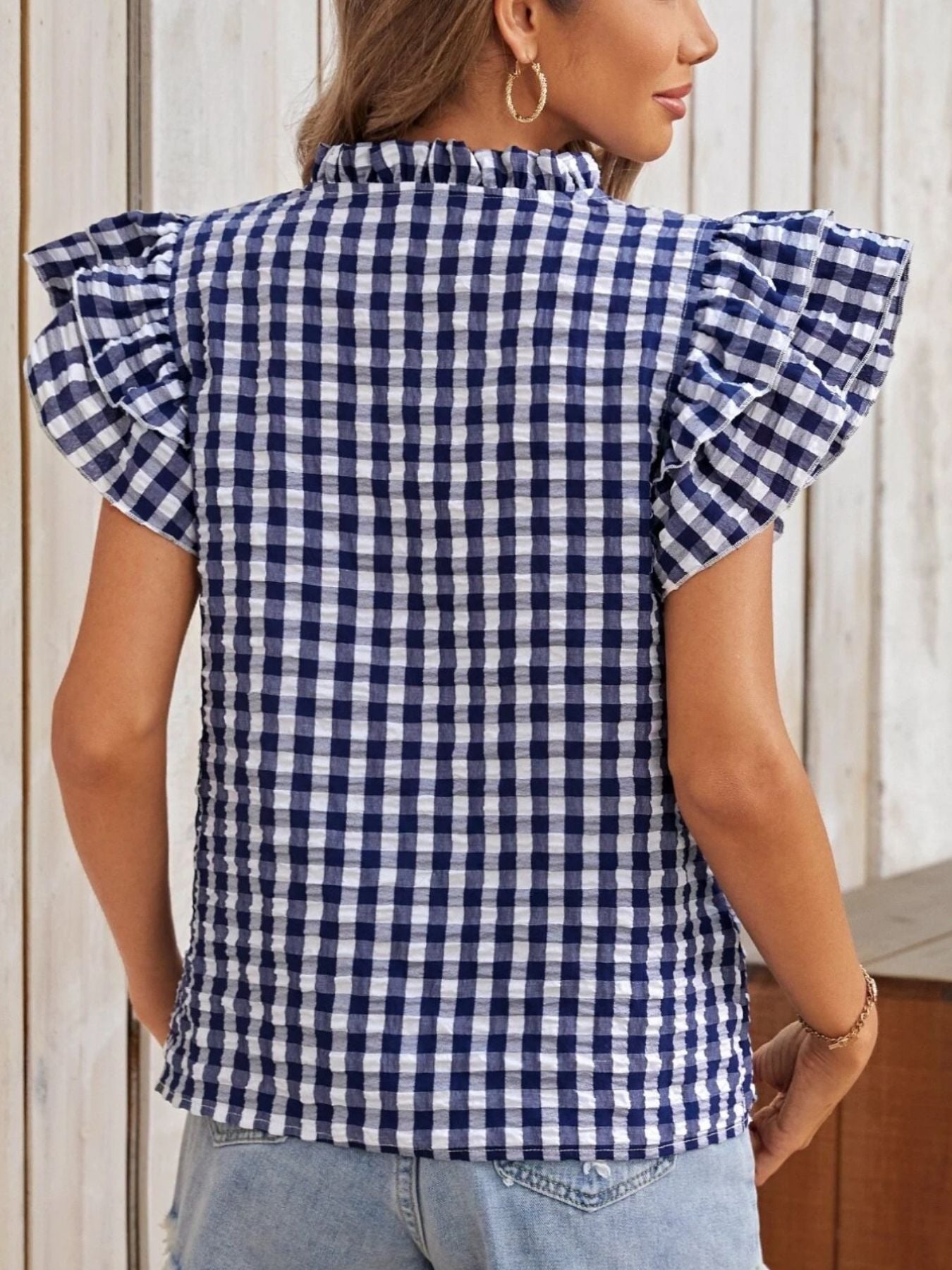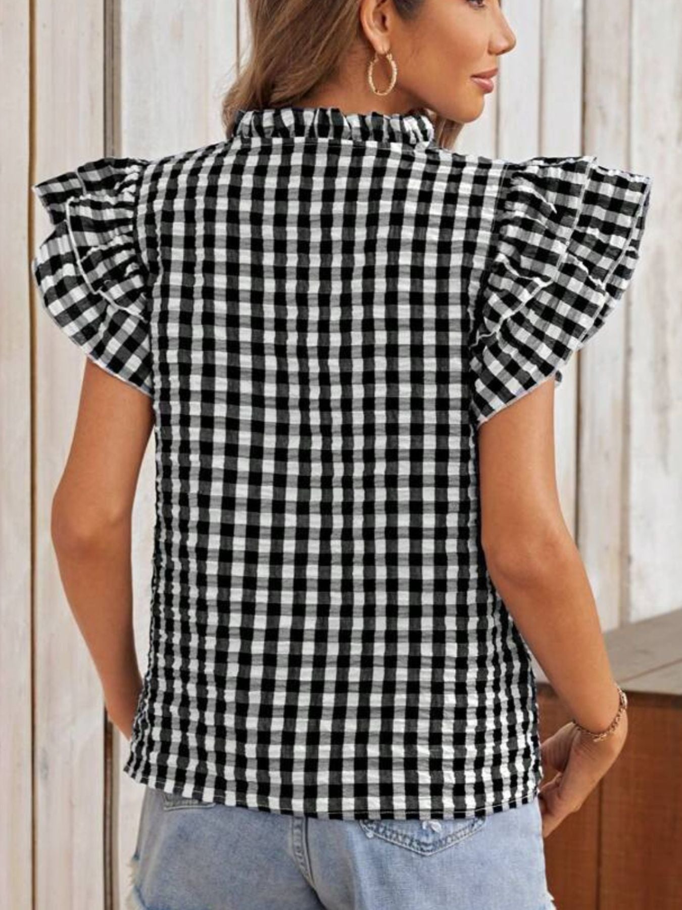 Gingham Ruffle Sleeve Blouse – V-Neck Casual Puff Sleeve Summer Top