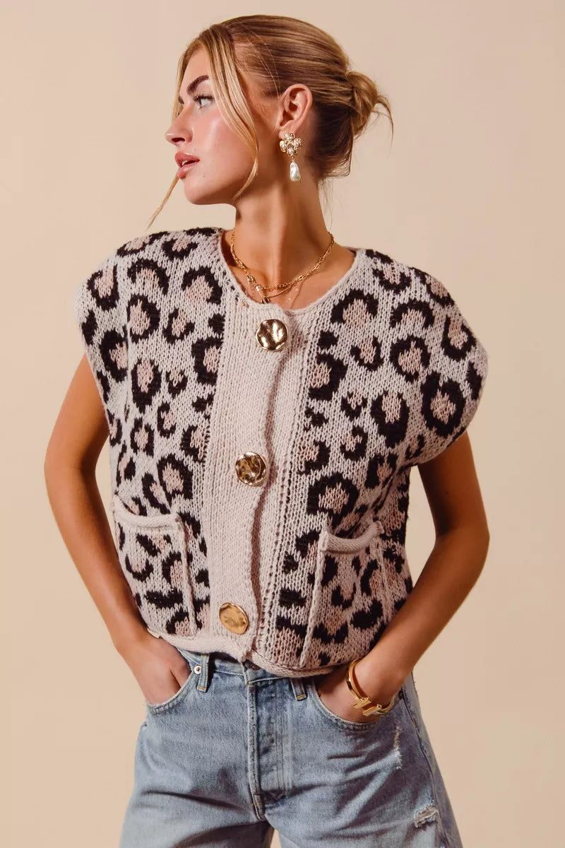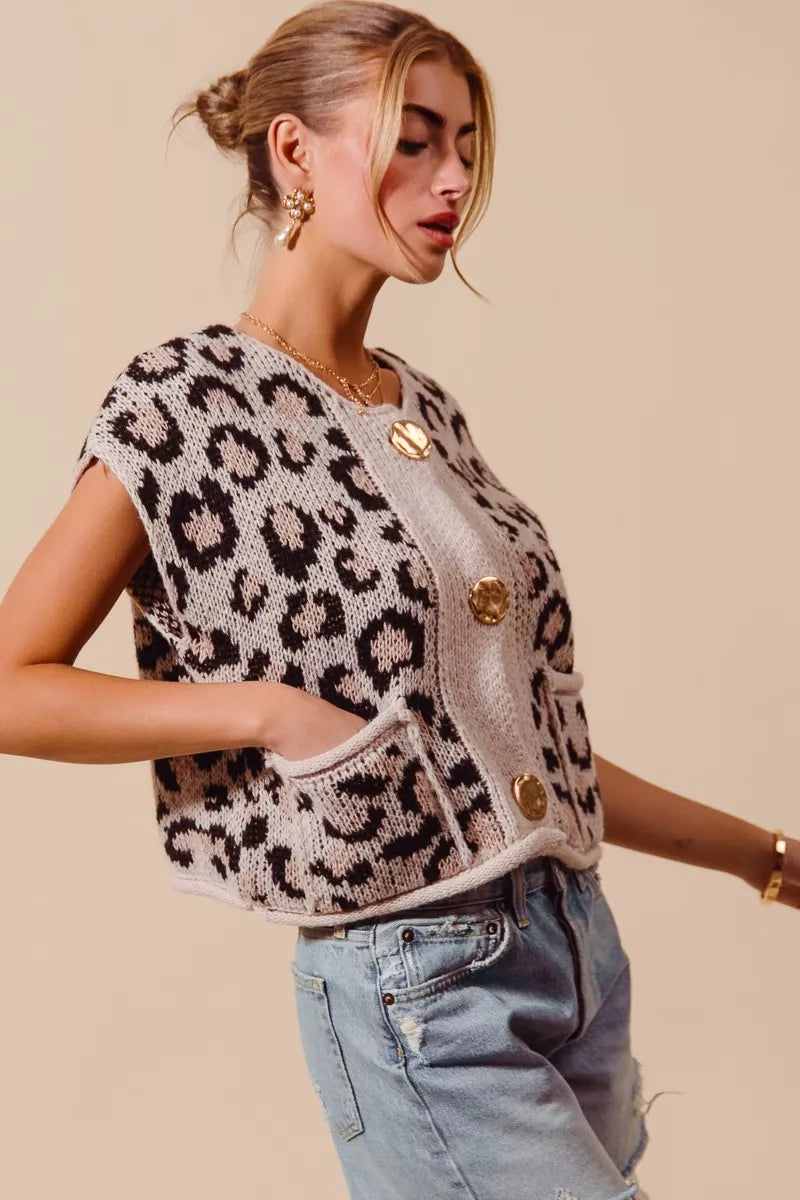 SO ME Big Metal Button Front Leopard Sweater Vest