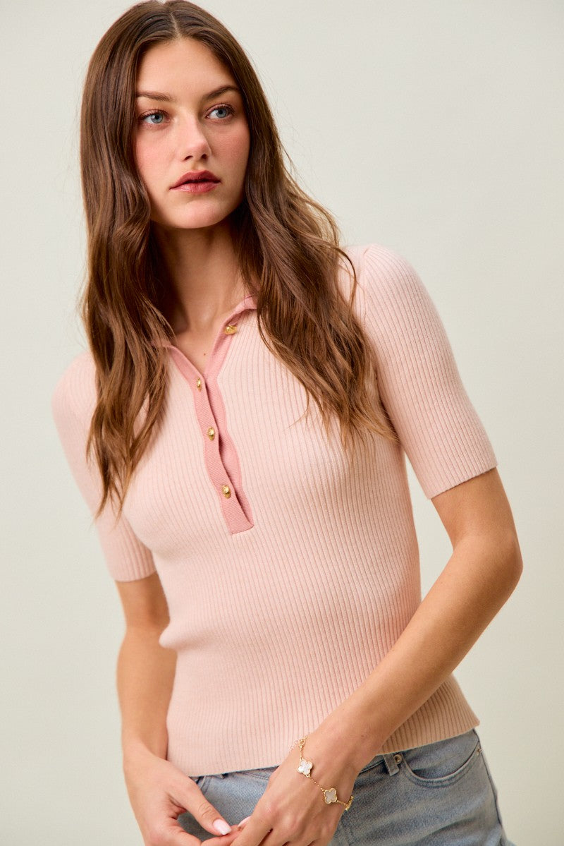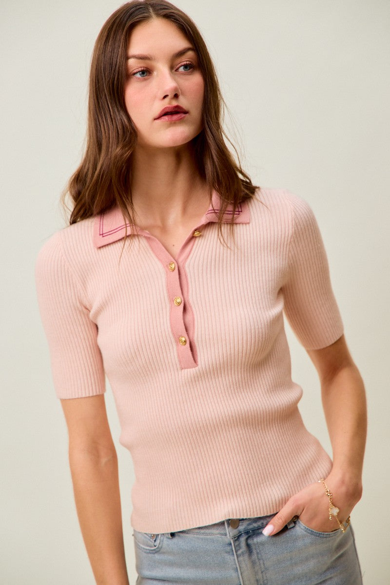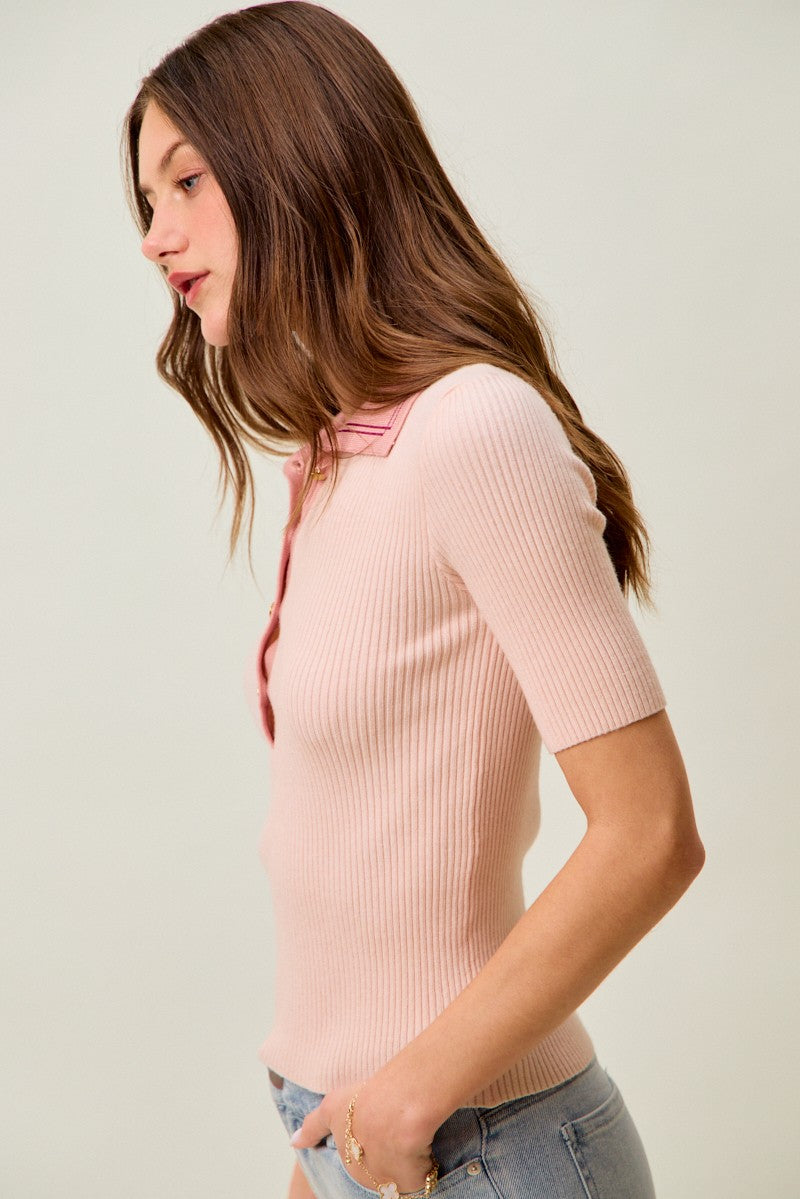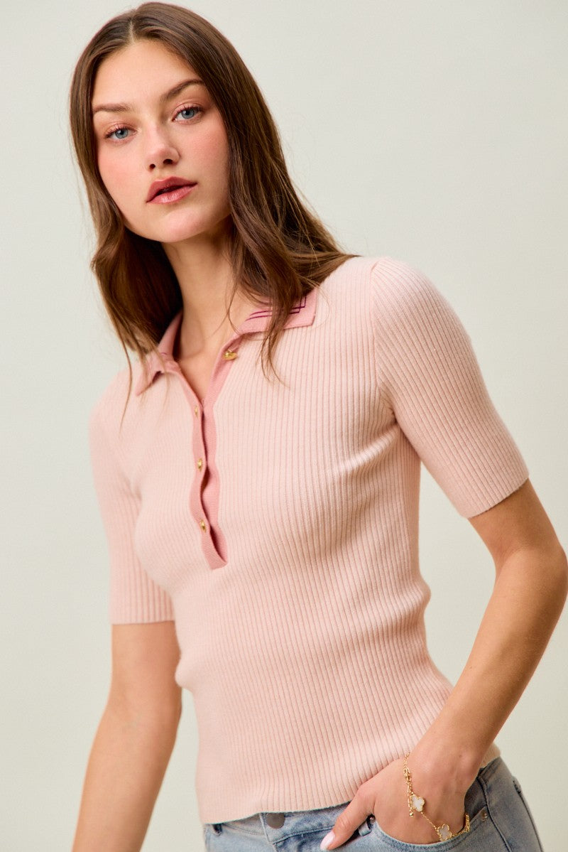 SO ME Contrast Collar Stretchy Rib Knit Short Sleeve Top